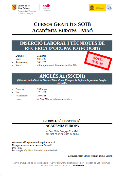 Noves dates cursos gratuïts Idiomes Soib – Acadèmia Maó