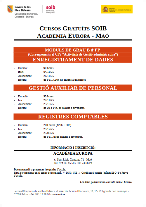 Oferta cursos gratuïts Mòduls Grau B d’FP – Acadèmia Maó