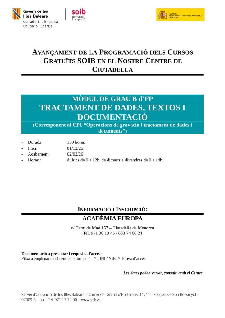 Proper curs d’Administració gratuït SOIB 2025_26. Centre de Ciutadella.