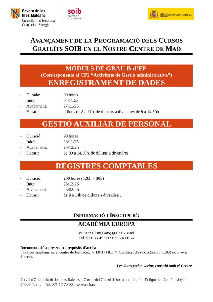 Propers cursos gratuïts d’Administració 2025_26. Centre de Maó.